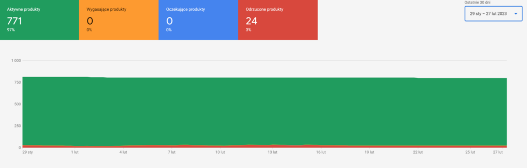 Zanim jednak wspomniane kampanie powstały to niezbędnym było odpowiednie przygotowanie feeda produktowego i jego integracja z Google Merchant Center. Klient nie posiadał konta GMC, więc w jego imieniu założyliśmy i skonfigurowaliśmy je od zera.
