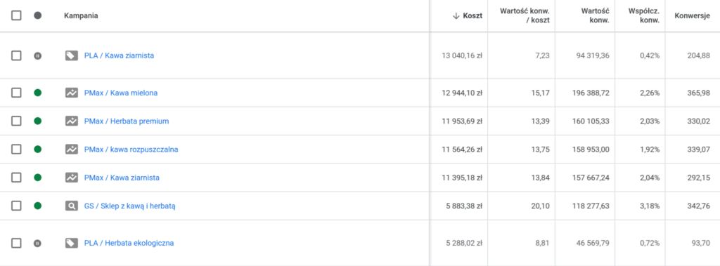 W poniższej tabeli widać wyraźnie, że kampanie Performance Max osiągały wyższy stopień zwrotu z inwestycji (ROAS), niż standardowe kampanie produktowe PLA. Postanowiliśmy więc w pewnym momencie całość działań reklamowych oprzeć na PMaxach, zaś standardowym PLA wstrzymać wyświetlanie reklam. Kampanie PLA osiągały zwrot na poziomie 600-880%, zaś Performance Max na poziomie nawet 1500%. Po 2 latach aktywnej promocji klienta w Google Ads widać wyraźnie, że była to dobra decyzja, która pozwoliła jeszcze efektywniej spożytkować budżet reklamowy.