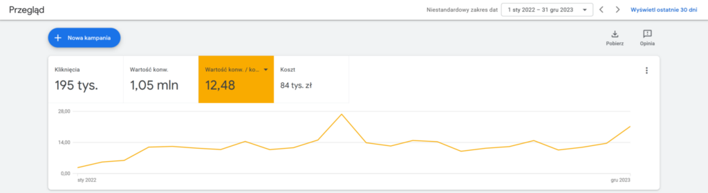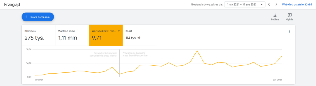 Naszą współpracę z klientem uznajemy za duży sukces. Szczególnie, jeśli zestawimy wyniki osiągane przez nas w latach 2022-2023 z rezultatami samodzielnie prowadzonych reklam przez klienta w roku 2021.