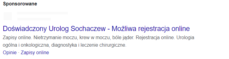 - “Urolog Sochaczew” – wyświetlająca reklamy na słowa kluczowe zawierające nazwę głównej lokalizacji klienta